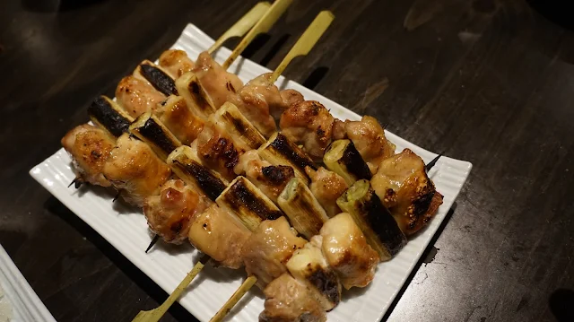 Yakitori - Negima. Since the skewered chicken is made of all chicken thigh, there's leek to balance out in case you think you're stuffing yourself with too much chicken.